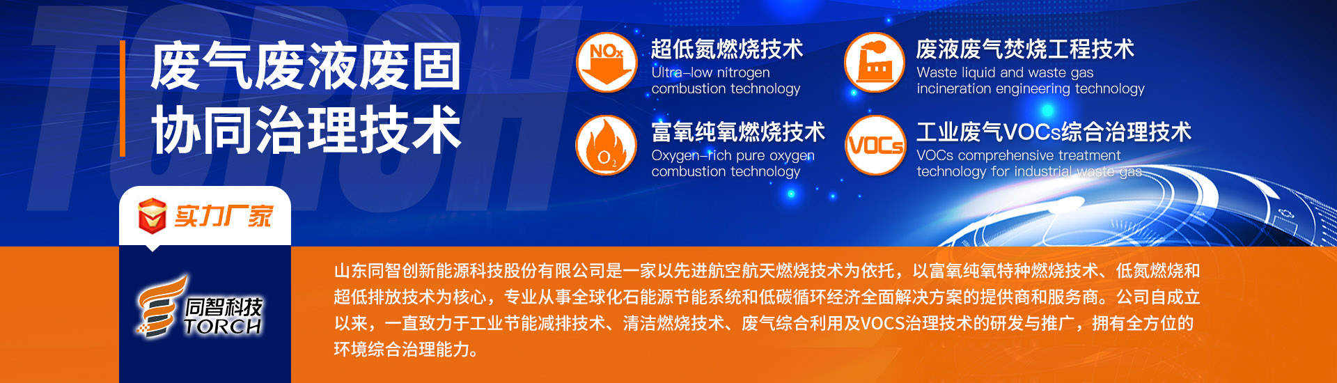 山東同智創(chuàng)新能源科技股份有限公司是一家以先進航空航天燃燒技術(shù)為依托,以富氧純氧特種燃燒、低氮燃燒和超低排放技術(shù)為核心,專業(yè)從事全球化石能源節(jié)能系統(tǒng)和低碳循環(huán)經(jīng)濟全面解決方案的提供商和服務(wù)商。公司自成立以來,一直致力于工業(yè)節(jié)能減排技術(shù)、清潔燃燒技術(shù)、廢氣綜合利用及VOCs治理技術(shù)的研發(fā)與推廣,擁有國內(nèi)一流的環(huán)境綜合治理能力,是節(jié)能環(huán)保行業(yè)的領(lǐng)導(dǎo)者。